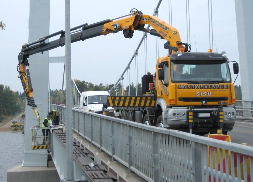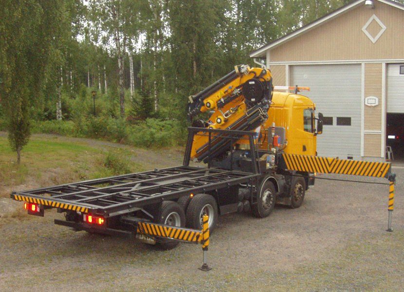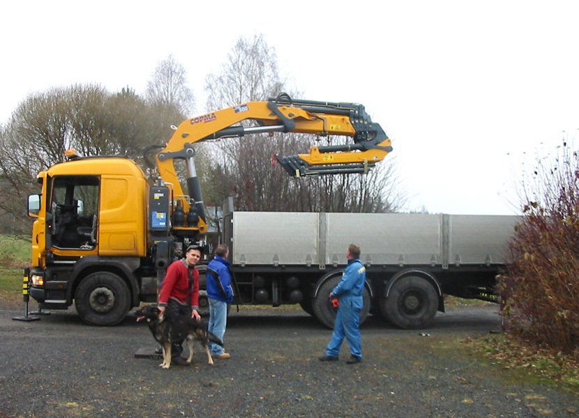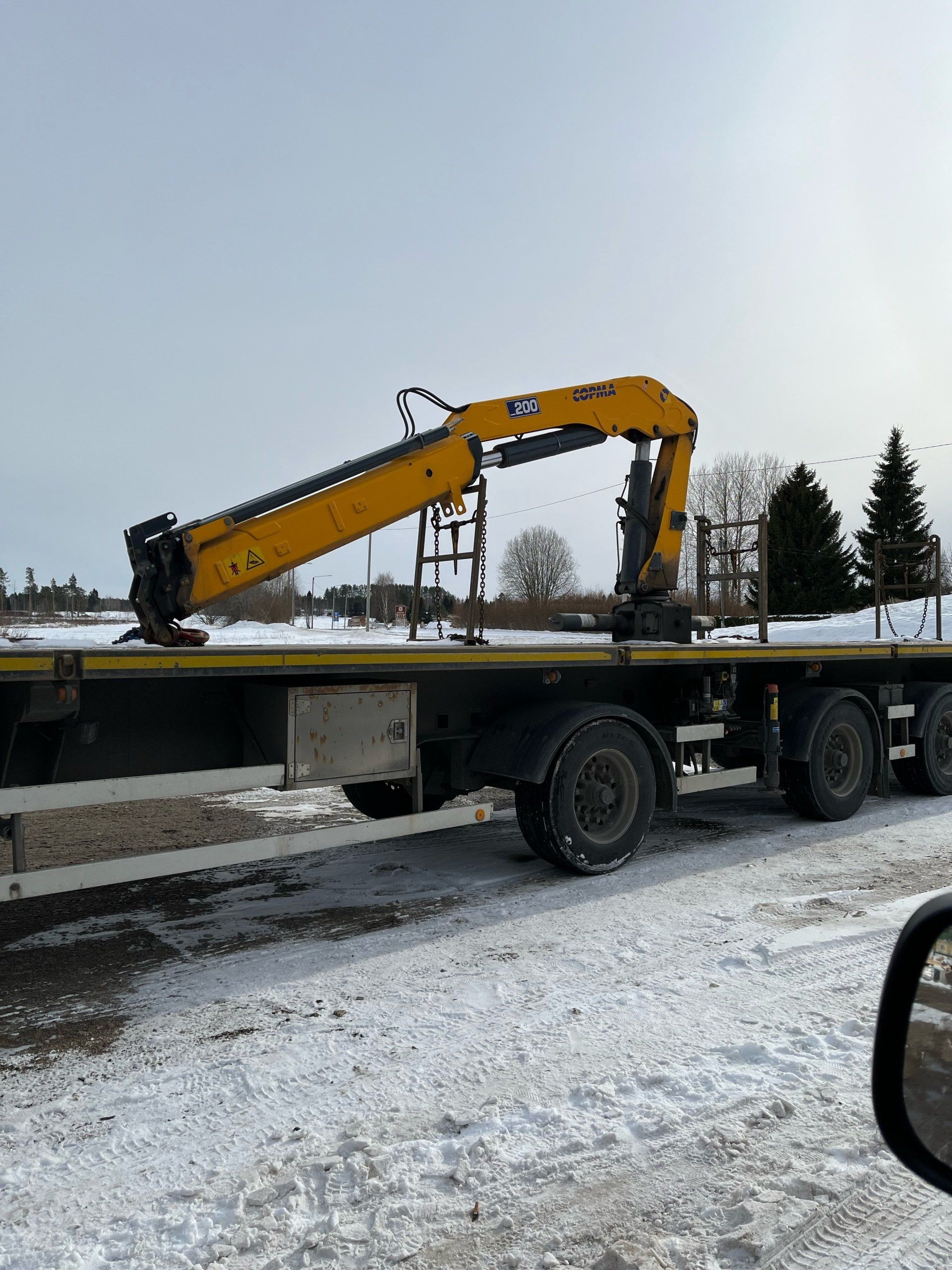 Copma 200.3 nosturi, kiinnitys perävaunun kanteen, radio. Lisä-tukijalat kiinnitetty perävaunun runkoon.