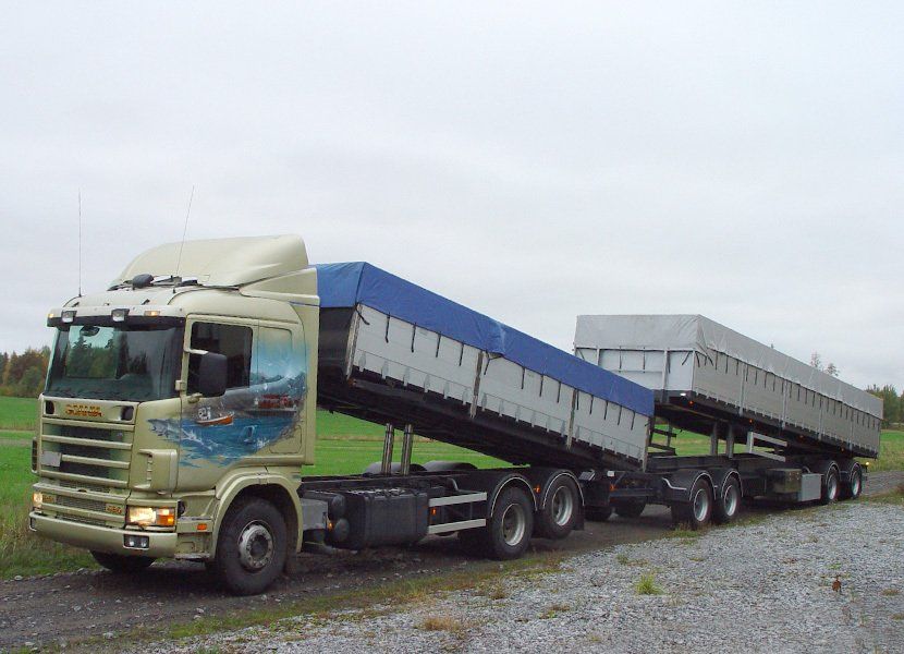 Scania R 124 6x2 kippaavat konttilaitteet pv:n ja nosturin hydrauliikka 7,7m rahtilava, 1,2m laidat 4-akselinen kippiperävaunu rahtilava 11,9x2,55x1,2+0,2, ilmajousitus